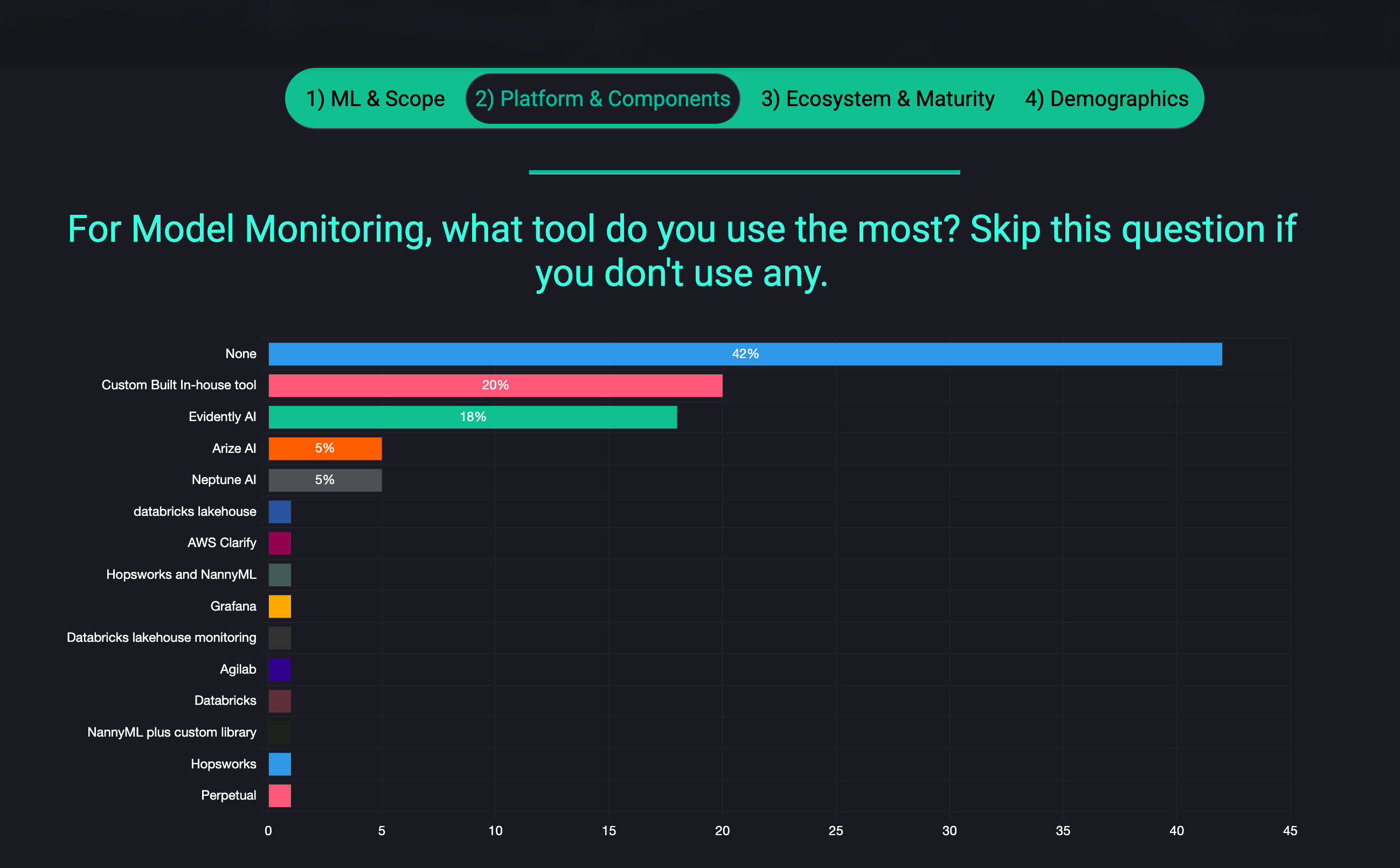 About 40% of organisations do NOT have monitoring in their Machine Learning (+10% YoY)! On ML Monitoring tooling, 20% is custom / in-house (-7% YoY) and almost 20% EvidentlyAI (+7% YoY)! |