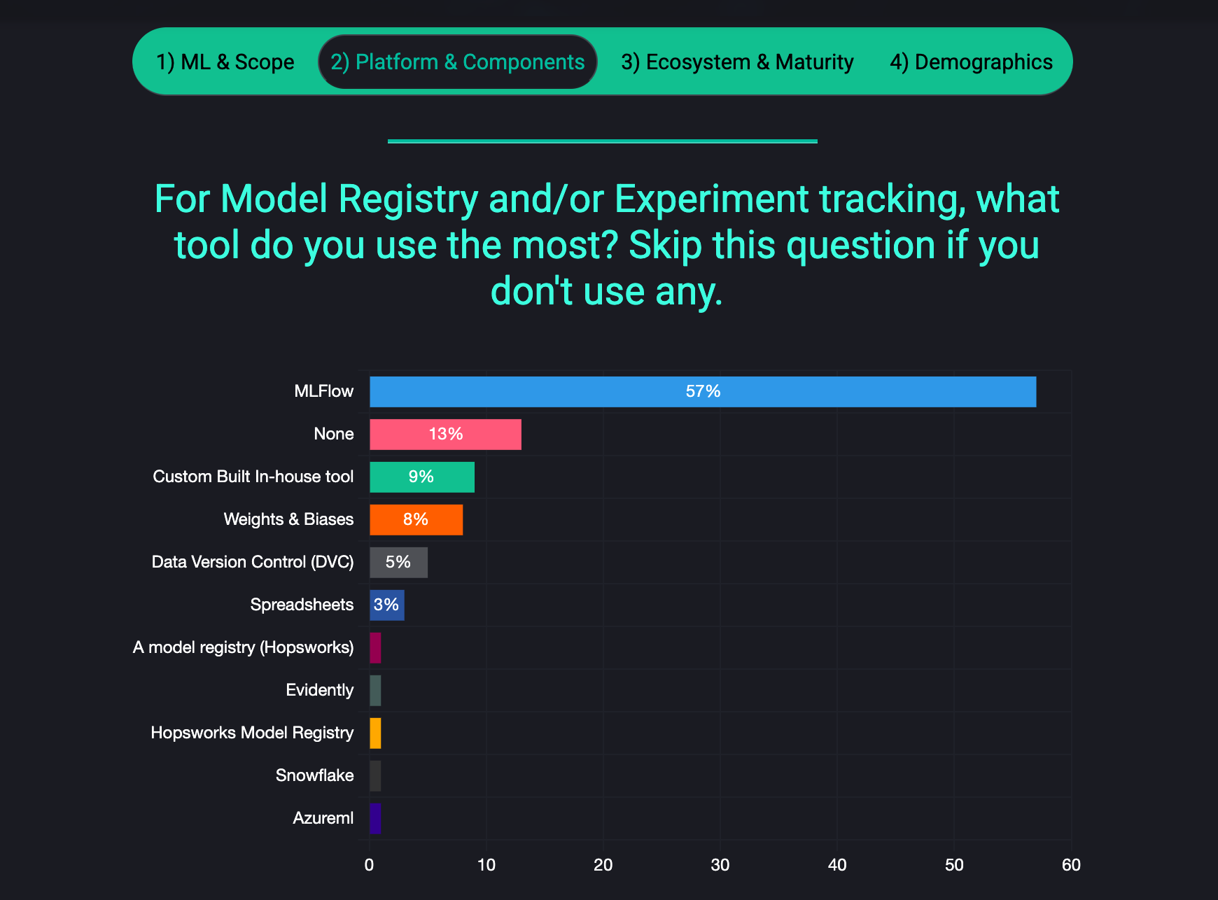 MLFlow is dominating Experiment Tracking space in ML in 2025 with 57% adoption (vs 42% in 2024)! Additionally, it makes me very happy to say that this year, Spreadsheets are down to 3% (vs 10% in 2024) - great work everyone 😂!! Closely following we have W&B with 8% (vs 7% in 2024) and DVC with 5% (vs 5% in 2024). The space of Experiment Trackers seem to be the most consolidated space across the MLOps lifecycle by far! |
