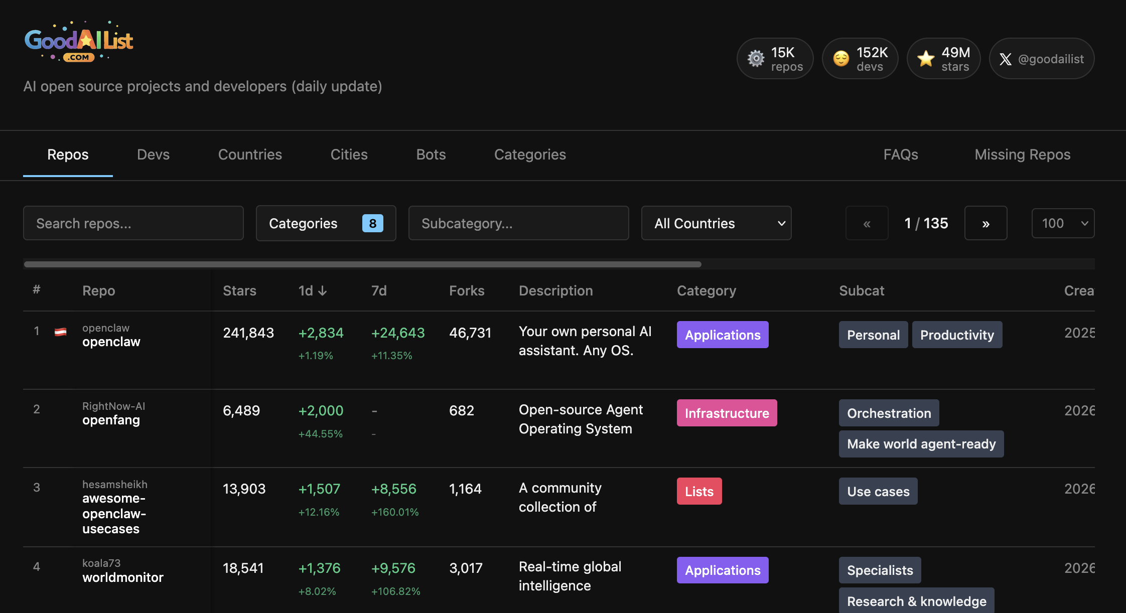 | |  | If you're building ML systems in 2026, Chip Huyen released an actively updated list of the top and fastest growing AI open source projects sorted by category and sub-category, super useful: The Good AI List is updated daily as a leaderboard for tracking what's trending in open-source AI on GitHub indexing ~15K repos / ~150K developers. I really like how it is possible to find the fastest growing projects with 1-day and 7-day star deltas, which shows right now there's a massive explosion of accelerated popularity for repos across the board. For production ML practitioners, the practical value is triage and discovery, we can use it to spot fast-moving infra (agent runtimes, sandboxes, orchestration, RAG plumbing), emerging "skills/prompt" ecosystems, and tooling that’s gaining real adoption signals. If you haven't this is definitely a resource that is worth checking out and bookmarking for reference as well. |